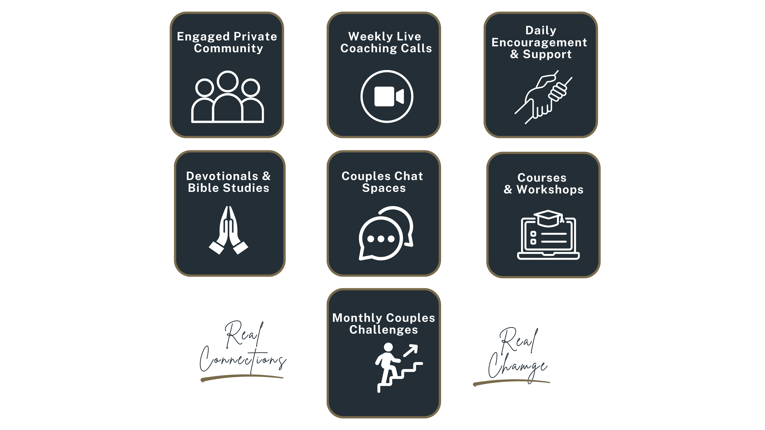 You'll have direct access to couples coaching, opportunities to ask questions in real-time, and friendships with other couples who are genuinely invested in your growth.